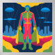 This is a stylized and colorful digital illustration with a retro science fiction aesthetic. A central figure, possibly a hero or astronaut, stands prominently in a vibrant, multi-layered landscape. The figure wears a brightly colored suit in shades of pink, blue, green, and yellow, along with a clear helmet. Behind the figure, a stylized cityscape with tall blue buildings is visible against a yellow and red horizon. Above, several blue flying saucers and parachutes float in a dark blue, star-dotted sky. The overall style is reminiscent of vintage sci-fi book covers or posters, with flat colors and bold shapes creating a dreamlike and slightly surreal atmosphere. The composition and elements suggest a narrative of space exploration, heroism, or a fantastical journey.