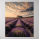 Champs de lavande romantiques illuminés sous un ciel pastel au coucher du soleil dans le sud de la France.