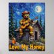 Cette oeuvre captivante présente un ours, habillé comme pompier avec casque et lunettes de soleil, profondément immergé dans une "rhapsodie" sur une guitare acoustique, perché sur le toit d'un cabine en bois rustique. Une grande lune lumineuse et des étoiles dispersées illuminent le ciel nocturne texturé, entouré de grands arbres à feuillage persistant. Un bocal de miel est posé sur le sol en contrebas, et "Love My Honey" est exposé en évidence. La brosse texturée et vibrante crée une atmosphère animée et exaltante, qui exprime parfaitement l'atmosphère douce et capricieuse de ce concert extérieur unique.