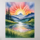 A breathtaking watercolor scene of a majestic sunrise bursting over snow-capped mountains, with golden rays illuminating a calm river winding through lush green meadows and evergreen forests. The reflective water and dramatic sun create a sense of hope and natural beauty—perfect for inspirational posters, canvas prints, and nature-themed decor.