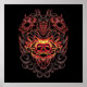 Un personnage démoniaque, enveloppé dans l'obscurité et orné de cornes et de traits squelettiques, exécute un rituel. Les mains de la figure sont tendues vers un crâne brillant reposant sur un piédestal, entouré de flammes et de fumée tourbillonnante.