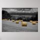 Photo prise de balles de foin qui semblent se diriger vers la ferme au loin.