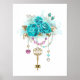 Clé d'or antique aux roses turquoise tendance décorée de feuilles d'or blanc et de perles rose et bleu. Couleur tendance. Rose turquoise. Blanc doré. Tiffany bleu.