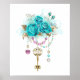 Clé d'or antique aux roses turquoise tendance décorée de feuilles d'or blanc et de perles rose et bleu. Couleur tendance. Rose turquoise. Blanc doré. Tiffany bleu.
