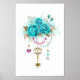 Clé d'or antique aux roses turquoise tendance décorée de feuilles d'or blanc et de perles rose et bleu. Couleur tendance. Rose turquoise. Blanc doré. Tiffany bleu.