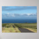 Un chemin de terre vallonné qui mène à la belle côte bleu hawaïenne, de l'herbe de chaque côté et des bouffées de nuages dans le ciel azur. Prise sur la Grande Île d'Hawaii.