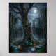 Une cour surréaliste éclairée par la lune est dominée par un arbre ancien colossal, ses racines tordues et son écorce texturée formant une présence presque sculpturale. Derrière lui, les ruines d'une demeure gothique autrefois grandiose se dressent dans une élégante décadence, avec des fenêtres brisées, de la pierre qui s'effrite et des allées envahies par la végétation. La douce lumière de la lune filtre à travers la brume qui dérive, illuminant des champignons lumineux, de la pierre humide et des détails naturels complexes. La scène mélange la nature et l'architecture en une composition mélancolique mais raffinée, pleine de profondeur et d'atmosphère. Cette œuvre d'art est idéale pour les amateurs de fantasy sombre et de paysages mystérieux et intemporels.