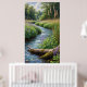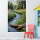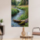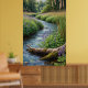 Un ruisseau forestier tranquille serpente à travers des berges verdoyantes, bordé de quenouilles et de lupins violets. La lumière du soleil filtre à travers les arbres, créant un paysage naturel paisible idéal pour les thèmes de la nature et de plein air.