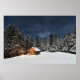 Cabine d'hiver rustique la nuit dans un paysage enneigé.