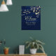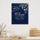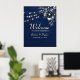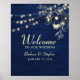 Bienvenue à vos invités dans le style avec notre élégante affiche de mariage, avec un design rustique chic en bois de grange en bleu marine. Décorée de dentelle dorée à fleurs dorées et de lampes à cordes scintillantes, cette pièce moderne et d'inspiration campagnarde donne un ton sophistiqué à votre journée spéciale.