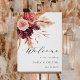 Ce panneau d'accueil mariage présente des fleurs rustiques aquarelles en terre cuite, bordeaux, orange brûlé, jaune, rougissant avec de l'herbe pampa beige et marron. Pour une personnalisation plus avancée de cette conception, cliquez sur le lien "customiser plus loin". Des articles correspondants sont également disponibles.