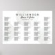 Poster d'un grand tableau de sièges en dollars de sable pour une grande réception de mariage. Les dollars de sable blanc sont l'arrière - plan du texte noir. Nom de famille marié en haut avec les noms de l'Épouse et de la chambre en dessous, ainsi que la date. Utilisez chaque section pour ajouter des noms d'invités par ordre alphabétique ou par numéro de table au fur et à mesure que vous choisissez. Supprimez les sections inutiles.