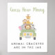 Sympa signe de jeu pour votre baby shower avec "Devinez combien de crackers animaux sont dans le pot" écrit dans un mélange d'un script vert jungle amusant et simple typographie grise et une illustration aquarelle d'animaux de zoo (lion, éléphant, zèbre, singe et girafe) empilés dans un véhicule safari. Placez un bocal ou une bouteille remplie de craquelins animaux en dessous et demandez à vos invités de deviner combien sont dans le bocal. Le gagnant sera l'invité qui se rapproche le plus sans passer par là. Les cartes de devis correspondantes sont disponibles dans notre collection de Baby showers de Safari animal mignon.