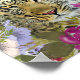 Un féroce léopard regarde d'un cadre de fleurs colorées.