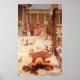 “Saint Eulalia” by John William Waterhouse shows a solemn, winter lit scene set in an ancient courtyard of pale stone and towering columns. In the foreground, the young martyr lies stretched across the ground, her rich red drapery and flowing hair forming the strongest notes of color against the cold whiteness around her. A small gathering of onlookers lingers at a distance, their muted robes and hesitant postures suggesting shock, grief, and uneasy curiosity, while a lone guard stands watch nearby.