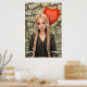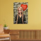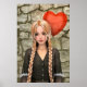 Le rendu numérique 3D d'une belle adolescente en robe rétro tenant un ballon en forme de coeur sur un arrière - plan mural en pierre. Un cadeau parfait pour la Saint-Valentin