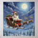 This whimsical poster features a festive cat in a Santa hat lounges in a garland-trimmed sleigh led by two reindeer over a snowy pine forest under a moonlit, starry winter sky.