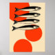 Cette illustration graphique minimaliste représente des sardines contre des disques de soleil noirs et rouges vibrants. Un choix parfait pour ceux qui apprécient une représentation artistique simple mais moderne de la vie marine.