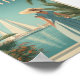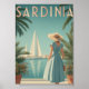 This elegant vintage poster portrays a woman dressed in classic 1950s fashion strolling along Sardinia’s picturesque promenade. Behind her, graceful sailing boats float peacefully in the turquoise harbor waters, framed by the island’s rugged coastline. The artwork uses warm, muted tones and nostalgic textures to evoke the charm and relaxed elegance of mid-century Mediterranean life. Ideal for lovers of vintage style, coastal beauty, and timeless travel art.