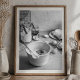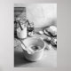 Apportez une atmosphère intemporelle et nostalgique à votre espace avec cette photographie en noir et blanc capturant une scène de cuisine rustique. Avec un arrangement classique de farine, d'œufs, d'un bol à mélanger et d'ustensiles traditionnels, cette image célèbre la beauté simple de la cuisine maison et des moments quotidiens. Les tons monochromes accentuent la texture et le contraste, faisant de cette œuvre une pièce polyvalente qui complète les intérieurs de style fermier, minimaliste et contemporain.