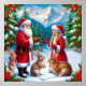 Illustration délicieuse sur le thème de Noël du Père Noël, un jeune enfant, et un lapin au milieu d'un arrière - plan enneigé et festif orné de cadeaux et de décorations.