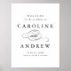 Une Affiche de bienvenue Mariage classique en noir et blanc avec les noms des couples et l'élégant script de calligraphie et avec la date et l'emplacement de l'événement. Cliquez sur le bouton Modifier pour customiser cette conception avec vos détails.
