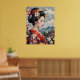Ce tableau est un portrait serein d'une femme japonaise habillée d'un kimono rouge vif aux motifs floraux blancs. Ses cheveux sont habillés d'un updo traditionnel orné de fleurs blanches et de broches à cheveux ornées. Les yeux fermés doucement, elle s'exprime paisiblement sur fond de pagode, de montagne enneigée et de branches de fleurs de cerisiers.