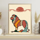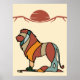 Bring a touch of modern serenity to your walls with this "Kind Lion" abstract art poster from the "Serene Savanna" collection by Cor de Flor Design. This vertical print features a sophisticated composition of a stylized lion and minimalist sun, masterfully rendered in a curated earthy palette—terracotta, forest green, and ochre.