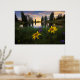 This photo features early morning light bathing a pond surrounded by wildflowers.