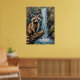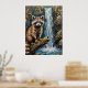 Cette charmante peinture présente un raton laveur à fourrure brun et blanche, une queue rayée et une expression curieuse, debout sur un logarithme tombé. Derrière le raton laveur, une cascade pittoresque descend une falaise rocheuse dans un ruisseau tranquille en contrebas. La toile de fond est une scène de forêt luxuriante avec une cascade rocheuse et un ruisseau clair, rendu avec des coups de pinceau épais et texturés, lui donnant une sensation vivante et vibrante.