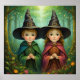 Two young witches stand side by side in an enchanted forest, wearing traditional witch attire. Each has a tall black pointed hat with a gold buckle and flowing cloaks - one in emerald green and one in burgundy red. The magical forest background glows with floating golden lights among the trees, while colorful wildflowers bloom at their feet. Finished as a watercolor art print.