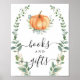 Cette affiche de livres et cadeaux de baby shower est ornée d'un citrouille d'aquarelle et d'une couronne de feuillage doré en automne.