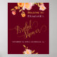Script de calligraphie or chic et classe bienvenue affiche de douche nuptiale avec des peonies de pêche rousses et de lettrage or / blanc sur un arrière - plan bordeaux foncé Veuillez noter que la couleur arrière - plan vin rouge foncé est modifiable. Vous pouvez le modifier, ainsi que les polices de lettres et la couleur, après avoir sélectionné l'option "customiser plus loin".