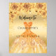 Un panneau de bienvenue pour une fête de Quinceañera, 15 ans. Un fond doré faux avec des étincelles de paillettes dorées, une robe et des roses, des fleurs. Personnalisez et ajoutez un nom.