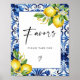 Voici notre signature de Fête des mariées de citrons méditerranéens, un ajout charmant et élégant à votre célébration. Avec des motifs de citron vibrants et des éléments de design d'inspiration méditerranéenne, ce panneau dirige magnifiquement les clients vers la table de faveur, en s'assurant qu'ils ne manquent pas vos marques de reconnaissance réfléchies. Idéal pour les épouses qui adorent l'esthétique ensoleillée et les détails réfléchis, notre signe de faveurs ajoute une touche de sophistication et de coordination à votre décor de douche nuptiale. Suivez-nous pour des mises à jour sur de nouveaux produits et des idées plus méditerranéennes pour créer des rassemblements inoubliables.