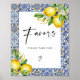 Voici notre signature de Fête des mariées de citrons méditerranéens, un ajout charmant et élégant à votre célébration. Avec des motifs de citron vibrants et des éléments de design d'inspiration méditerranéenne, ce panneau dirige magnifiquement les clients vers la table de faveur, en s'assurant qu'ils ne manquent pas vos marques de reconnaissance réfléchies. Idéal pour les épouses qui adorent l'esthétique ensoleillée et les détails réfléchis, notre signe de faveurs ajoute une touche de sophistication et de coordination à votre décor de douche nuptiale. Suivez-nous pour des mises à jour sur de nouveaux produits et des idées plus méditerranéennes pour créer des rassemblements inoubliables.