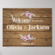 Élégante typographie et fleurs de plume boho avec des textures de lattes de bois. Signal mariage personnalisable. Bienvenue au mariage de l'affiche.