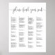 Tableau des sièges invités mariages en noir et blanc classique "s'il vous plaît trouver votre siège" en haut dans le script de calligraphie manuscrit fantaisie, avec vos assignations de table invités en dessous, arrangé par ordre alphabétique sur quatre colonnes.