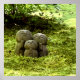Three stone figures rest together in a moss-covered garden, blending naturally into their surroundings.