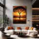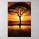 Un paysage africain serein au coucher du soleil, avec une grande silhouette d'acacia contre le soleil couchant. La lumière dorée et la végétation luxuriante créent une atmosphère de tranquillité et de beauté naturelle.