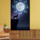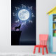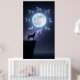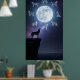 Silhouette d'un husky hurlant sur une falaise sous une immense pleine lune révélant les constellations
