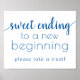 Calligraphie florissante bleu et blanc moderne de princesse cobalt horizontale douche, fête ou panneau de table de réception "Sweet Ending to New Beginning" avec un script amusant et décontracté écrit à la main. Le design classique comprend une superposition de la typographie de citation à la main moderne. La belle police avec une couleur arrière - plan personnalisable permet de s'adapter facilement à n'importe quel thème. Pour d'autres couleurs ou produits correspondants, veuillez visiter le magasin JustFharryn Zazzle, ou contacter le concepteur, c/o fharryn@yahoo.com Tous droits réservés. #zazzlemade