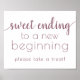 #Mauvelous Sophistiqué mauve rose rose et blanc horizontal "Sweet Ending to New Beginning" douche, fête, ou panneau de table de réception avec un script amusant et décontracté écrit à la main. Le design classique comprend une superposition de la typographie de citation à la main moderne. La belle police avec une couleur arrière - plan personnalisable permet de s'adapter facilement à n'importe quel thème. Pour d'autres couleurs ou produits correspondants, veuillez visiter le magasin JustFharryn Zazzle, ou contacter le concepteur, c/o fharryn@yahoo.com Tous droits réservés. #zazzlemade