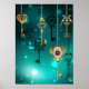Or, clés antiques avec engrenages et cadrans accrochés sur chaînes dorées sur arrière - plan vert lumineux.