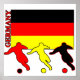 Three German soccer players in silhouette play in front of the German flag. Country name Germany is on the side