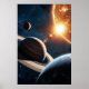 A brilliant sun rises over a collection of massive ringed planets and drifting moons, illuminating the deep blue nebula beyond and creating a dramatic, high-detail cosmic scene perfect for sci-fi and astronomy fans.