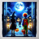 Affiche effrayante d'Halloween avec un art aérien représentant un petit garçon et une petite fille en costume de clown et de sorcière sortant de la maison pour rencontrer un monstre effrayant au bout de leur trottoir.