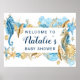 Sous l'enseigne de bienvenue pour une baby shower Bleu Or de Sous la Mer (affiche) avec des hippocampes, des étoiles de mer, des coquillages et des récifs coralliens avec calligraphie moderne. Pour une personnalisation avancée de ce design, veuillez cliquer sur le bouton "Personnaliser" ci-dessus ! Des articles assortis sont également disponibles.