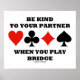 Les joueurs de ponts et les partenaires de pont de tous âges et de tous niveaux d'expérience apprécieront ce pont en disant affiche avec les costumes de quatre cartes ainsi que le dicton "Soyez gentil avec votre partenaire lorsque vous jouez au pont". Montrez votre attitude de pont avec une dose de conseils de pont sonore avec cette affiche!