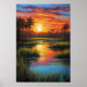 Alors que le jour annonce ses adieux, une symphonie fascinante de charmantes teintes orange et rouge se déroule sur la toile du ciel. L'étreinte dorée du soleil caresse le paisible paysage marécageux, projetant de longues réflexions enchanteresses sur les eaux calmes. Un chef-d'oeuvre de la nature peint dans le style classique de l'huile, capturant la danse sereine entre la lumière et l'obscurité.